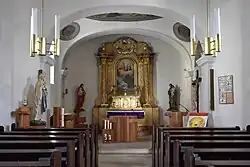 Der Hochaltar weist einen neoromanischen Tabernakel auf. Das Ölbild an der Wand stellt den heiligen Leonhard dar, der die Dreifaltigkeit anbetet. Am unteren Rand ist eine Landschaft mit der Ansicht der Kirche dargestellt. Es wurde um 1800 gemalt.