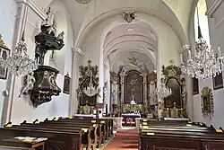 Das Kircheninnere zeigt sich einheitlich barock. Das dreijochige Langhaus hat eine Stichkappentonne auf Gurtbögen auf breiten gestuften Pilastern. Die dreiachsige Westempore ist kreuzgratunterwölbt. Der eingezogene Triumphbogen ist barock korbbogig. Der zweijochige Chor hat eine Stichkappentonne über Doppelgurten, die Apsis schließt mit einem ausgerundeten Fünfachtelschluss. Die Sakristei im Turmerdgeschoß hat ein Kreuzrippengewölbe aus dem Ende des 14. Jahrhunderts.