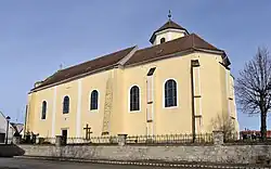 Der barocke Kirchenbau mit einem gotischen Chor und einem Nordturm ist von einem Friedhof umgeben.