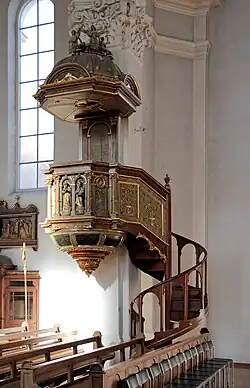 Der Taufstein, die Bänke und Beichtstühle sind von 1906.