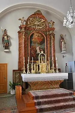 Der Hochaltar entstand um 1770. Das Altarbild zeigt das Martyrium des hl. Laurentius. Die Seitenaltäre entstanden in der zweiten Hälfte des 18. Jahrhunderts und sind als Nischenaltäre mit Aufsatz gleich aufgebaut. Die Nischenfigur des linken Seitenaltares zeigt das Herz Jesu aus dem 19. Jahrhundert. Die barocken Seitenfiguren zeigen den heiligen Wendelin und den heiligen Florian. In der Nische des rechten Seitenaltars befindet sich eine barocke Pietà. Die seitlichen Figuren stellen den hl. Joachim und die hl. Anna dar.