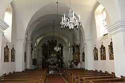 Das Kircheninnere zeigt ein dreijochiges Langhaus unter einem Kreuzgratgewölbe aus 1689 auf eingestellten Wandpfeilern mit Kämpferkapitellen. Die Westempore entstand nach 1945. Der leicht überhöhte dreijochige Chor hat im Mitteljoch ein Platzlgewölbe und im 1. und 3. Joch eine Stichkappentonne auf Wandpfeilern mit vorgeblendeten Doppelpilastern. Die Sakristei ist platzlgewölbt.