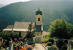 Der barockisierte Bau mit romanischem Kern besitzt einen geraden Chorabschluss aus dem ersten Viertel des 18. Jahrhunderts. Die Fassade wird von zarten Pilastern, deren Kapitelle mit Lambrequinmotiven verziert sind, gegliedert. Über dem Giebel der Westwand erhebt sich ein gemauerter Turm mit Glockenhelm. Die Glocke wurde 1741 von Franz Anton Mayer gegossen. Nördlich des Chores ist die Sakristei angebaut.