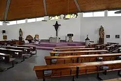 An der Ostwand hängt ein barockes Kruzifix, das aus der Kirche in Bubendorf stammt. Seitlich steht ein barocker Taufbrunnen. Die bemerkenswerten Holzfiguren des heiligen Thomas und des heiligen Augustinus stammen vom ehemaligen Hochaltar und stehen jetzt an der Westwand. Sie wurden 1972 restauriert.