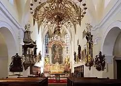 Die Kanzel aus dem dritten Viertel des 18. Jahrhunderts ist reich dekoriert. Auf dem Korb ist ein Relief angebracht, das „Christus und die Samariterin“ darstellt. Auf dem Schalldeckel erkennt man Puttenfiguren mit den Symbol der Göttlichen Tugenden. Gegenüber der Kanzel ist eine Kreuzigungsgruppe aus dem dritten Viertel des 18. Jahrhunderts. Diese steht unter einem Baldachin und hat eine Rahmung, die mit dem der Kanzel vergleichbar ist.
