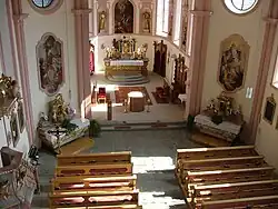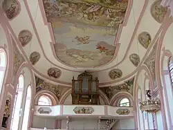 Der Hochaltarbild Bischof Ulrich von Augsburg deckt die Unschuld eines vermeintlichen Ehebrechers auf malte Balthasar Riepp um 1730. Der linke Seitenaltar zeigt das Fresko Anbetung der Könige nach Tiepolo, der rechte Seitenaltar zeigt das Fresko Mariä Himmelfahrt, beide gemalt von Otto Hämmerle 1941 nach einem Original von Tiepolo.