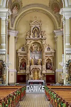 Der geräumige Bau im Neorenaissance-Stil hat ein fünfjochiges Langhaus, das als Wandpfeilerkirche mit Kapellen und Emporen ausgeführt ist. Der eingezogene einjochige Chor unter einer Kuppelwölbung hat einen geraden Schluss. Neben der Hauptfassade steht der Turm. Die Glasfenster sind aus 1900.