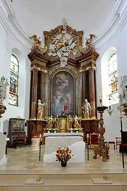 Die Ausstattung der Kirche wurde zum größten Teil im dritten Viertel des 18. Jahrhunderts angefertigt und zum Teil 1924 verändert. Der Hochaltar hat eine ionische Doppelsäulenädikula mit geschwungenem Volutenauszug in grün-braunem Stuckmarmor und verfügt über weiß gefasste, teils vergoldete Figuren der Heiligen Petrus und Paulus, ein Gottvater-Relief im Auszug, ein Altarbild der Taufe Christi sowie einen freistehenden Altartisch mit einem barocken Tabernakel, flankiert von zwei knienden Cherubim. Die vier Seitenaltäre wurden 1924 teilweise verändert und mit Figuren ausgestattet. In den beiden vorderen Nischen befinden sich zwei Säulenädikulaaltäre mit Sprenggiebeln und weiß gefassten Figuren der Gottesmutter und des Heiligen Rochus auf Konsolen. Der Marienaltar wird flankiert von Figuren von Antonius Eremita und einem Pilgerheiligen. Beim Josefsaltar, dessen Altarbild den Heiligen Rochus zeigt, stehen Statuen der Heiligen Elisabet und ihres Sohnes, Johannes dem Täufer. Das Altarbild am linken hinteren Altar zeigt die Stigmatisation des Heiligen Franz von Assisi. Begleitet wird es von Figuren des heiligen Kaiserpaares Heinrich und Kunigunde (oder Salomo und die Königin von Saba). Die Darstellungen auf dem Gebälk zeigen die Heiligen Scholastika und Katharina. Der rechte hintere Altar ist mit einem Bild des Bernhard von Clairvaux ausgestattet. Dieses wurde in der zweiten Hälfte des 18. Jahrhunderts gemalt, aber erst 1970 in den Bilderrahmen eingesetzt. Die Figuren in diesem Altarraum stellen die Heiligen Wolfgang und Bonifatius dar. Die spätbarocke Kanzel aus der Zeit um 1770 verfügt über reichen figuralen Dekor. Am Korb ist ein Relief Guter Hirte mit Putten zu sehen, auf dem Schalldeckel der Auferstandene mit Putten und Attributen der drei göttlichen Tugenden.