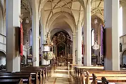 Die monumentale dreischiffige Hallenkirche beeindruckt mit einem in gleicher Breite durchlaufenden Chor und einer dreiseitig eingestellten Empore. Das vierjochige Langhaus umfasst eine Westwand mit Empore und eine Nordwand aus der Bauzeit 1418/1450 und eine Südwand und der Einwölbung auf Oktogonalpfeiler um 1510. Das Gewölbe zeigt im Mittel- und Südschiff rasterartige Kassettenrippen mit Rautenakzenten und zum Teil gebrochenen Anläufen. Die nördliche Pfeilerreihe wurde in Scheidbögen übergeführt. Das Nordschiff zeigt ein niedrigeres, dichteres und unregelmäßigeres Rippennetz, welches mit bemalten Wappenschilder versehen ist, und an der Nordwand in einer sechsteiligen Wandfolge anläuft. Die dreiseitig umlaufende Empore aus der Bauzeit um 1418/1450 mit einer Kassettenbrüstung auf Pfeilerarkaden ist westseitig kreuzrippenunterwölbt und im Mittelschiff mit Spitzbogenarkaden geöffnet. Die längsseitigen Emporen aus der 1. Hälfte des 16. Jahrhunderts sind kreuzgratunterwölbt und rundbogig geöffnet und wurden 1848 um zwei korbbogige Achsen ostwärts erweitert. Die drei Triumphbögen am Übergang vom Langhaus zum Chor sind spätgotisch profiliert. Der hallenartige Chor ist mit einem Kreuzgratgewölbe auf schlanken Quadratpfeilern und Pilastern überwölbt. Die an Chorhaupt angebaute Sakristei hat in beiden Geschoßen ein barockes Kreuzgratgewölbe, eine spätgotische Eisenplattentüre und zwei Lavabonischen mit Muscheldekor. Das kreuzgratgewölbte Turmerdgeschoß aus der 2. Hälfte des 13. Jahrhunderts ist vierseitig geöffnet, die Öffnungen zu den seitlichen Kapellen zeigen Spitzbogenarkaden. Die seitlichen zweijochigen Kapellen haben Stichkappentonnen auf Gurten auf Pilastern. Es gibt 12 stuckierte Weihekreuze aus 1689 bzw. 1719. Die neugotische Glasmalerei Maria und kreuztragender Christus schufen die Glasmaler C. H. Burkhardt und A. Ferstl (1859). Die Glasmalerei Herz Mariä und Herz Jesu schuf die Mayer’sche Hofkunstanstalt in München (1893). Die figürliche Glasmalereien in den seitlichen Turmkapellen schuf von 1955 bis 1957 die Firma Karl Knapp.