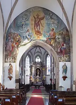 Das Langhaus hat drei Joche und ein Kreuzrippengewölbe auf teils gebündelten Wandvorlagen bzw. im Emporenjoch auf spitz zulaufenden Konsolen mit scheibenförmigen Schlusssteinen. Die zweiachsige spätgotische Westempore ist kreuzrippenunterwölbt auf gedrungenen Achteckpfeilern. Die Empore hat eine neogotische Steinbrüstung mit einer Kartusche mit dem Wappen des Stifts Lilienfeld und der Jahresangabe 1901–1905. Der Treppenturm hat ein Schulterportal. Der zweijochige Chor hat ein Kreuzrippengewölbe auf Wand- bzw. Konsoldiensten und vegetabil reliefierten Schlusssteinen. Der Chor hat Maßwerkbaldachine mit neugotischen Statuen der Heiligen Peter und Paul, Katharina und Barbara und seitlich flache abgemauerte Maßwerknischen. Es gibt eine in Spitzbogen zum Langhaus geöffnete Seitenkapelle mit einem Kreuzrippengewölbe und einer gefasten Sakramentsnische. Die Sakristei mit einem spätgotischen Schulterportal hat ein zweijochiges Kreuzgratgewölbe auf Konsolen und Eckdiensten; die ehemaligen Rippen sind entfernt.