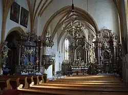 Der Hochaltar mit Umgangsportalen hat einen Aufbau aus 1641, 1697 vom Bildhauer Franz Kamerlander verändert, er schuf die Statuen Josef und Antonius.