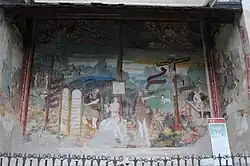 An der Fassade der Kirche ist ein Freskenzyklus von 1560 bis 1570 erhalten, der eine typisch evangelisch-lutherische Bildsprache der Reformation dokumentiert. Der Zyklus, der biblische Worte des Alten und Neuen Testaments enthält, konnte sich trotz konsequenter Rekatholisierung während der Gegenreformation in der Steiermark halten.[1]