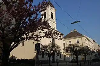 Die Kirche steht etwas zurückversetzt mit einem Vorplatz an der Reindorfgasse, Ecke Oelweingasse in Rudolfsheim-Fünfhaus.