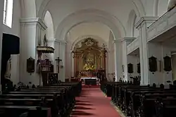 Das Kircheninnere ist ein breiter, einfach gegliederter Saalraum mit ausgerundeten Ecken. Er hat ein Platzlgewölbe zwischen Doppelgurtbögen. Diese ruhen auf Wandpfeilern mit Doppelpilastern. 1861 wurde die Kirche um ein nördliches Seitenschiff in ähnlichen Formen erweitert. Die ursprünglichen Wandpfeiler wurden hier zu quadratischen Pfeilern. Über dem seichten, östlichen Vorhallenjoch ist eine leicht vorschwingende Empore mit einer Balustradenbrüstung. Die Empore hat ein flaches Tonnengewölbe mit Stichkappen. Der quadratische Chorraum hat ein Platzlgewölbe. Der breite, nördliche Anbau ist zweigeschoßig. Über dem flachgedeckten Seitenschiff ist eine Empore mit Platzlgewölben. Seitlich des Chores, über der flachgedeckten Sakristei ist die ehemalige Trauungskapelle. Diese ist ein zweijochiger, tonnengewölbter Raum.