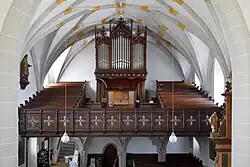 Das einschiffige Langhaus ist dreijochig, ebenfalls mit Netzrippengewölbe. Der dreijochig Chor, ebenfalls mit einem Netzrippengewölbe, ist etwas abgesetzt. Er endet mit einem 5/8 Schluss. Die vierachsige Empore an der Westseite wird von einem Netzrippengewölbe getragen. Sie wird teilweise durch einen barocken Vorbau verdeckt. Eine spätgotische Sakristeitür führt in die Sakristei mit einem spätbarocken Netzrippengewölbe.