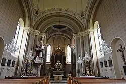 Das Kircheninnere hat ein flaches Kuppelgewölbe. Der auf Wunsch der Baudirektion so ausgeführte eingestellte Turm trägt einen Spitzhelm.