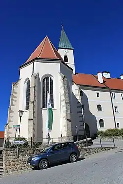 Die spätgotische Hallenkirche ist ein bemerkenswert einheitlicher Kirchenbau um 1450/1457. An der Nordseite steht das ehemalige Hieronymitanerkloster von 1698 in der Nutzung als Pfarrhof und Volksschule.