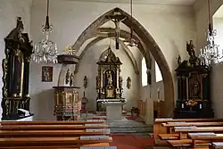 Das barockisierte Langhaus unter einer Flachdecke hat eine hölzerne Westempore. Der breite Fronbogen ist spitzbogig. Der zweijochige Chor mit einem geraden Schluss hat ein kräftiges Kreuzrippengewölbe auf Konsolen. Das zweibahnige Ostfenster zeigt eine Glasmalerei von Franz Weiss aus 1965. Das schlanke Sakristeiportal ist spitzbogig. Die Sakristei ist nördlich am Chor angebaut.