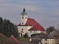 Die Kirche wurde von 1786 bis 1790 erbaut, parallel auch das Pfarrhaus,[2] das bis 1887 auch als Schule diente.[5] Die Mittel kamen aus dem Religionsfonds, von den hierortigen Herrschaften (Dominien) und von der Pfarrgemeinde.[6] Vogtei hatte anfangs die Herrschaft Sierning inne.[6]