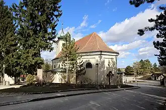 Die Kirche besteht aus einem schlichten Langhaus. Daran schließt im Süden ein gleich breiter Chor mit polygonalem Schluss ab. Die Fassade ist mit Lisenen und Lunetten gegliedert. Am ersten Langhausjoch befindet sich ein gotisches Schlitzfenster. Der nördlichen Eingangsfassade ist der Kirchturm vorgestellt. In den Untergeschoßen sind gotische Schlitzfenster, im Glockengeschoß sind rundbogige Schallfenster. Der Kirchturm schließt nach oben hin in einem Zwiebelhelm ab. Am dritten Langhausjoch sind westlich und östlich jeweils ein eingeschoßiger Kapellenanbau angebaut. Die Sakristei schließt westlich an den Chor an.