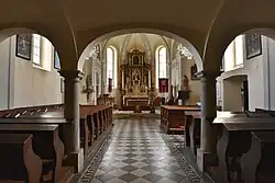 Das dreijochige Langhaus hat Kreuzgratgewölbe mit Gurtbögen auf Pilastern. Die dreiachsige Westempore hat ein Platzlgewölbe. Das östliche Langhausjoch ist mit querschiffartigen Nischen verbreitert. Der einjochige Chor hat eine polygonale Apsis. Seitlich beidseits des Chores ist eine Sakristei und Oratorien.