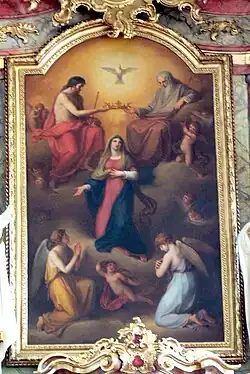 Der Hochaltar ist ein Viersäulenaufbau über einem geschwungenen Grundriss. Er wurde 1763 vom Tischlermeister Jakob Schilling geschaffen. Auf dem Altar flankieren weiß gefasste Figuren das Altarbild, auf der linken Seite steht der heilige Augustinus, auf der rechten der heilige Ambrosius. Sie wurden von Leopold Feuerstein geschaffen. Das Altarbild stellt die „Krönung Mariens“ dar. Das Bild wurde in den Jahren 1799 bis 1801 von Angelika Kauffmann in Rom gemalt und 1802 eingefügt. Die Putten mit den Symbolen der Göttlichen Tugenden auf den Altaraufsätzen stammen von Leopold Feuerstein. Das Oberbild im Volutenauszug zeigt die heilige Katharina und die heilige Margaretha. Es wurde 1763 von Bernhard Müller gemalt. Der Tabernakel stammt von Greber, Berchtold und Schneider und wurde nach Plänen von Bildhauer M. Wötzer zwischen 1840 und 1844 geschaffen. Das Standkreuz in der Rundbogennische stammt vom Ende des 18. Jahrhunderts. In den Seitennischen sind Reliquien eingefasst.