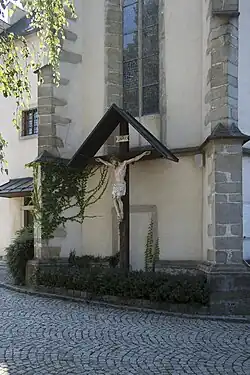 An der Ostseite der mit Strebepfeilern gestützten Apsis befindet sich ein lebensgroßes Holzkruzifix aus der Zeit nach 1900.