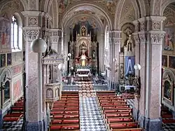 Der Besucher betritt die im Stil der Neuromanik erbaute Hallenkirche durch das schlichte, der Bundesstraße zugekehrte Eingangsportal und gelangt in eine schmucklose Vorhalle, von der zwei Aufgänge in die darüber liegenden Emporen der Kirche führen. Nach dem Passieren des Eingangsbereiches öffnet sich vor ihm das dreischiffige Langhaus, das von zwei Schirmkuppeln überwölbt wird. Diese Kuppeln werden wie die Quertonnen der Seitenschiffe von vier mächtigen Pfeilern getragen. Der auf Mittelschiffbreite eingezogene Chor ist um fünf Stufen erhöht und mit einer Längstonne, in die Stichkappen einschneiden, eingewölbt. Hinter einem Gurtbogen, der das Langhaus vom Presbyterium trennt, liegt die Apsis mit dem Hochaltar. Das Altarblatt ziert ein Gemälde des Nazarenerkünstlers Franz Hellweger, das die Kirchenpatrone Petrus und Paulus und den heiligen Dominikus darstellt, über ihnen thront die Gottesmutter mit dem Jesuskind. Die Holzplastiken auf dem Hochaltar schuf Josef Miller, ein Schüler des Imster Bildhauers Franz Xaver Renn. Die Statuen auf den Seitenaltären fertigte Renn selbst. Die Sujets der Seitenaltäre wurden von Caspar Jele gestaltet. Sie zeigen Josef, den Nährvater, auf dem Sterbebett und auf der anderen Seite den heiligen Aloisius.