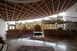 Der Altarraum nimmt die Ellipsenform des Turmes auf. Das Gestühl ist in der Art schlichter hölzerner Parkbänke ausgeführt, erinnert mit Laternenreihen an Park-Möblierung, und nimmt so die Formen aus dem Innenhof wieder auf.[11] Die Ausrichtung der Kirchenbänke zum Altarraums ist derart gewählt, dass erstere nicht auf den schlichten Volksaltar selbst, sondern auf den Tabernakel im einen Brennpunkt der Ellipse ausgerichtet sind. Im anderen Brennpunkt steht der Ambo.[1] Dieser subtile Bruch der gewohnten Achsenführung verdeutlicht noch einmal das Motto der Außenfassade. Die Kreuzwegfenster, rechterhand neben dem Altar,[12] in rhythmischer Anordnung auch an der Außenmauer sichtbar, stammen aus der Werkstatt des Stiftes Schlierbach in Oberösterreich.[4]