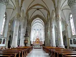 Die neugotische Kircheneinrichtung stammt aus der Bauzeit. Der neun Meter hohe, neugotische Hochaltar ist aus Eichenholz, reich geschnitzt und komplett vergoldet. Er wurde, wie die komplette Inneneinrichtung, vom Architekten Josef Erwin von Lippert konzipiert. Das Altarblatt hl. Elisabeth ist vom Maler Franz Josef Dobiaschofsky von 1866. Das Gemälde zeigt das sogenannte Rosenwunder, in dem sich das Brot in Rosen verwandelt – die geschnitzten Rosen im Rahmen des Hochaltarbildes nehmen darauf Bezug. Im Zuge einer ersten Renovierung 1902 kamen auch die Rundbilder im Chor (in Wachstechnik) vom Maler Ludwig Mayer hinzu. Der gleiche Künstler hatte Jahre zuvor die als Taufkapelle konzipierte Kapelle (heute Wochentagskapelle) mit Fresken ausgestattet. In den Lünetten der Kapelle sind die Darstellungen „Taufe Christi“, „Noahs Opfer“ und „Sintflut“, datiert 1867. Für die neugestaltete Wochentagskapelle (1984) fertigte der Goldschmied Ernst Grandegger den modernen Tabernakel und das Kreuz mit den emaillierten Enden. Die beiden Seitenaltäre enthalten Altarbilder von Josef Kessler (datiert 1866). Der linke Seitenaltar zeigt Maria, der rechte Seitenaltar eine Herz-Jesu-Darstellung. In mittelalterlicher Tradition verwendete der Maler einen ornamentierten Goldgrund, gemalt auf Holz.