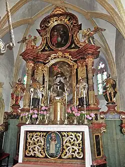 Der Hochaltar, ein Ädikula-Altar aus dem Rokoko, wurde 1767 gefasst und füllt den Chor in Höhe und Breite aus. Das Mittelbild zeigt den heiligen Gandolf, seitlich stehen die Statuen der Heiligen Johannes Nepomuk und wohl Franz von Sales sowie über den Opfergangsportalen die Heiligen Oswald und Donatus. Im Aufsatzbild ist die Heilige Dreifaltigkeit dargestellt. Das reliefgeschnitzte Antependium mit Jesus als gutem Hirten ist mit Laub- und Bandlwerk geschmückt.