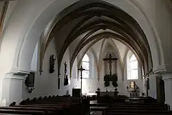 Das Kircheninnere zeigt das zweijochige Langhaus mit einem Kreuzrippengewölbe um die Mitte bis zum Ende des 14. Jahrhunderts auf Diensten und in den Ecken auf Konsolen. Die zweiachsige Orgelempore steht auf spätgotischen abgefasten Pfeilern und ist mit Stichkappentonnen aus dem Anfang des 16. Jahrhunderts unterwölbt, die Empore hat einen Balkonvorbau mit Blendmaßwerkverzierung aus dem 19. Jahrhundert. Unter der Empore ist ein stichkappengewölbter Zugang zum Westturm mit einem linksgedrehten Treppenaufgang. Der rundbogige breite gering eingezogene Triumphbogen hat zwei polygonale Pfeilerstümpfe. Der dreijochige spätgotische Langchor mit einem Fünfachtelschluss hat eine Rippengewölbe aus 1886 auf Konsolen. Das dreiachsige Oratorium wohl rechts als Obergeschoß zum Chor hat eine Blendmaßwerkabschrankung aus dem 19. Jahrhundert. Im Chor ist ein spätgotisches Schulterportal mit einer Eisenplattentür. Die Vorhalle hat ein Kreuzgratgewölbe aus dem 19. Jahrhundert.