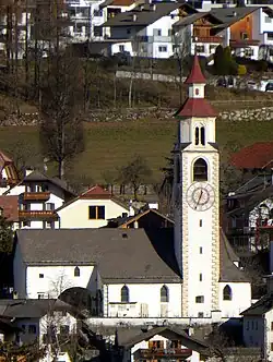 Die unter Denkmalschutz stehende, zweischiffige Kirche besitzt im Hauptschiff einen polygonalen Chorschluss, im Seitenschiff ein Sterngratgewölbe, während die Vorhalle ein Kreuzgratgewölbe trägt. Im Chor ist ein Wandgemälde mit dem Zug der hl. Drei Könige des Hans von Bruneck aus der Zeit von 1420 erhalten, von dem auch die Darstellungen des Ölbergs und des hl. Wolfgang sowie der hl. Kümmernis an der Außenseite der Kirche stammen. Das Wandgemälde im Seitenschiff hat das Thema der Gregoriusmesse, wobei links vorne die Befreiung Kaiser Trajans aus der Hölle und die Hl. Ottilia, rechts vorne die Stifterfamilie des Hans Primus zu sehen sind. Es wurde von Simon von Taisten im Jahr 1506 geschaffen. Die Kirche wurde später barock umgestaltet und mit rankengeschmückten Deckenfresken ausgemalt. Das Hochaltarbild stammt von Josef Renzler aus dem Jahr 1828 und zeigt die Apostel Jakobus den Älteren, Philippus und Jakobus den Jüngeren. Weitere Ausstattungsstücke sind ein Bild der Mutter Anna von Georg Kachler und eine Statue der Mondsichelmadonna am rechten Triumphbogenpfeiler.