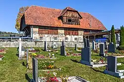 Auf der westlichen Seite der Kirche befindet sich der Friedhof. Rechts vom Eingang an der Friedhofsmauer befindet sich das Kriegerdenkmal, bestehend aus zwei überdachten Natursteinplatten mit den Namen der Gefallenen beider Weltkriege.[14] Gefallene kamen auch aus den Weilern Schneßnitz, Gassarest, Mitterdorf, Pölling und St. Peter.