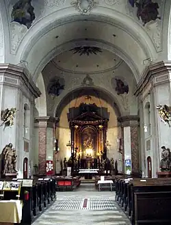 Zwei kreuzförmige überkuppelte Raumeinheiten mit halbkreisförmiger Apsis und ein halbrund schließendes Eingangsjoch bilden das Kircheninnere. Über dem Eingangsjoch ist eine stichkappenunterwölbte Orgelempore mit einer seitlich vorgezogenen Brüstung. Die Wände sind mit Pilastern, Rahmenfeldern und einem gekröpften Gesims gegliedert. Die Decken sind Hängekuppeln, die Kreuzarme sind tonnengewölbt. In den Gewölbezwickeln sind Wandgemälde Rupert mit R. Sagmeister bezeichnet, Leopold, Clemens, Heiliger und Evangelisten. Die Kuppelscheitel zeigen Strahlenkränze. Die Glasfenster aus dem Anfang des 20. Jahrhunderts zeigen figurale Darstellungen von Heiligen, in der Apsis Ochsenaugen mit Blumenvasen in Rahmungen und an der Empore Cäcilia (1913).