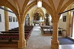 Das Kircheninnere zeigt ein dreijochiges Langhaus. Die dreiachsige kreuzrippenunterwölbte Westempore steht auf Achteckpfeilern und hat eine vorschwingende barocke Brüstung aus dem 18. Jahrhundert. Der leicht eingezogene Triumphbogen ist profiliert. Der um eine Stufe höhere zweijochige Chor schließt mit einem Dreiachtelschluss. Die Kirche zeigt überall Sternrippengewölbe, im Chor auf Achteckdiensten bzw. auf Wappenschildkonsolen, im Langhaus auf Dreiviertelrunddiensten. Bemerkenswert sind die zwei sich kreuzenden freien Stützrippen im Chorschluss. Die Glockenstube des Turmes ist kreuzrippengewölbt.