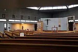 Der quadratische Innenraum weist Dreiecksnischen für die Beichtstühle auf. Nach oben hin öffnet sich die Kirchendecke in einen Tambour und einen Opaion. Von diesem geht ein in Beton gegossener Strahlenkranz aus.