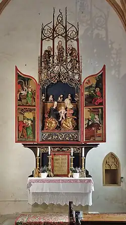 Der einjochige Altarraum im südlichen Seitenschiff besitzt ein Kreuzrippengewölbe über Absenkern mit figürlichen Konsolen. In der Mauer ist eine Sakramentsnische mit Blendmaßwerk eingelassen.