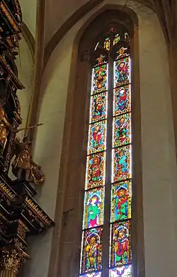 Die ersten drei Fenster sind um 1340 entstanden, das vierte um 1360. Im vierten Fenster sind die Heiligen Augustinus, Nikolaus, Erasmus, Martin sowie Ursula und Kunigunde dargestellt.