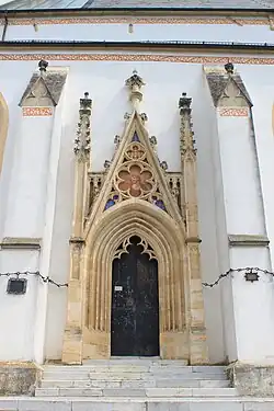 Das Südportal mit einer Freitreppe hat ein mehrfach profiliertes Spitzbogengewände, das von zwei hoch aufragenden Fialtürmchen mit Krabben und Kreuzblume umrahmt und von einem mit zentraler Fensterrose und weiterem Maßwerk ausgestatteten Wimperg bekrönt wird. Die Darstellung des Heiligen Hauptes Jesu in der Rosette stammt aus dem 19. Jahrhundert.