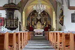 Das im Kern romanische vierjochige Langhaus hat eingestellte gotische Wandpfeiler mit aufgesetzten Halbkreisdiensten, das gotische Gewölbe hat gemalte Rippen. An das Ostjoch ist beidseits eine flachgedeckte Seitenkapelle angebaut. Die barocke dreiachsige Westempore steht auf abgefasten Pfeilern. Der nur angedeutete Fronbogen zeigt das Admonter Wappen und die Jahresangabe 1732. Der schmale im Kern gotische barockisierte Chor hat drei unterschiedlich lange Joche mit einem geraden Schluss. Das barocke Kreuzgratgewölbe zeigt einfache Eistab-Stuckleisten. In der Mitte der Chorschlusswand ist ein Strebepfeiler mit beidseits je einem gotischen Spitzbogenfenster. Am Westjoch des Chores steht nördlich ein Sakristeianbau unter einer Stichkappentonne, darunter befindet sich das ehemalige Beinhaus, darüber das Oratorium, südlich des Chores ist eine flachgedeckte Kapelle. Der viergeschoßige gotische Westturm mit Traufgesimsen verjüngt sich nach oben, die Turmhalle ist kreuzgratgewölbt. Die gotischen Portale des Turmes und des Langhauses sind spitzbogig.