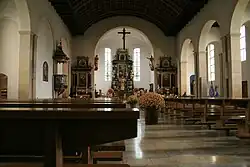 In den Neubau sind Portal, Altäre, Kanzel und Kreuzigungsgruppe des Vorgängerbaus als geschützte Ausstattungsteile integriert. Das rundbogige Portal von 1638/39 besteht aus einem profilierten Sandsteinrahmen und geschnitzten Türflügeln. Das Oberblatt des Hauptaltars und die Gemälde der Seitenaltäre stammen von [[Joseph Balmer (Maler)<Joseph Balmer]] (1877/78), zwei Figuren von Gregor Allhelg (1675). Im verglasten Sockel des rechten Altaraufbaus ist die Castorius-Reliquie zu finden.