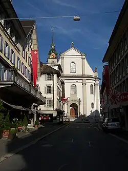 1762 vermerkte der Einsiedler Klosterbaumeister Kaspar Braun, dass die Kirche baufällig und zu klein sei. Den Neubau übernahmen Jakob Singer und sein jüngerer Bruder Johann Anton Singer, nachdem die Bauherrschaft 1763 mit ihnen einen Vertrag von 20'000 Gulden abgeschlossen hat.[4] Die neue Kirche, die von 1769 bis 1774 errichtet wurde, weist eine monumentale Fassade sowohl Richtung Hauptplatz wie am Hauptportal zur Herrengasse hin auf. Die Architektur gilt als spätbarock mit klassizistischen Elementen.[5]