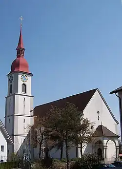 Kirchenschiff und Chor der Saalkirche entstanden 1705 im barocken Stil. Der Weihbischof in Konstanz, Konrad Ferdinand Geist von Wildegg, weihte die Kirche am 26. September 1710 ein. Die Kreuzigungsgruppe am halbkreisförmigen Chorbogen stammt wohl aus der originalen Bauperiode der Kirche, der barocke Taufsteinkelch wurde möglicherweise 1638, im Gründungsjahr der Pfarrei, für die St.-Nikolaus-Kapelle gefertigt, die bis zum Kirchenbau dort stand. 1718 wurde eine Vorhalle über der Eingangstreppen errichtet, die von toskanischen Säulenpaaren getragen wird. Die Kirchgemeinde liess 1749/50 an der Nordostseite durch Baumeister Lorenz Rey einen viereckigen Kirchturm mit Glockenhaube anfügen, auch eine neue Glocke wurde zu diesem Anlass gegossen.