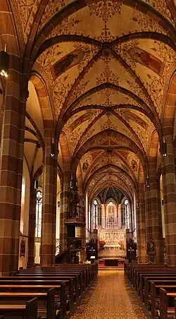 Das vierjochige Innere weist ein Kreuzrippengewölbe über Achteckpfeilern mit Runddiensten auf, im Osten schließt sich ein Vorjoch mit der Orgelempore über vier Bögen an. Der Raum ist durch horizontale und vertikale Elemente klar gegliedert, die durchlaufend gleiche Höhe von Mittelschiff und Presbyterium lässt ihn größer erscheinen. Die Seitenschiffe sind etwas niedriger. Das Gewölbe wurde zwischen 1888 und 1896 von Franz und Karl Jobst mit Rankenmalereien und Heiligendarstellungen geschmückt.