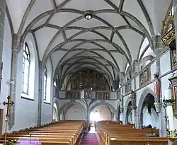 Das Langhaus hat drei östliche gotische Joche, zweischiffig mit einem breiten Hauptschiff und einem schmalen nördliche Seitenschiff, die zwei westlichen dreischiffigen Joche sind neugotisch, das südliche Seitenschiff springt querhausartig vorspringend. Die unterschiedlichen Seitenschiffe wurden mit dem Westjoch für den Einbau von Emporen genutzt, damit sind nur die vier östlichen Joche des Mittelschiffes als einheitlicher Kirchenraum (in der Art der Pfarrkirche Gramastetten) fassbar.