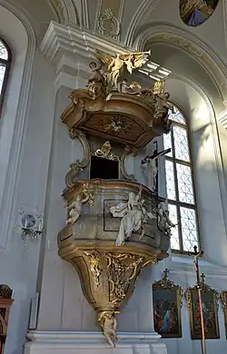 Die Altäre und die Kanzel sind im Rokoko-Stil ausgestaltet. Der Hauptaltar ist mit Holzstatuen der Heiligen Petrus und Paulus und zahlreichen Engeln bestückt.