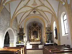 Im vierjochigen Langhaus ruht ein Sternrippengewölbe auf Konsolen bzw. auf Pfeilern mit halbrunden Vorlagen. Die Orgelempore von 1950 im Eingangsjoch steht auf einer Rundbogenarkatur mit abgefasten Pfeilern. In der Nordwand führt eine Arkadenöffnung in den Seitenschiffanbau mit einem barocken Kreuzgratgewölbe und Gurtbogen über Pilastern. In der Westwand des Seitenanbaues befindet sich ein kleines, spätgotisches Spitzbogenportal mit Eisentür, darüber der barocke Turmaufgang. Ein runder, abgefaster Triumphbogen verbindet das Langhaus mit dem gleich hohen Chor. Im Chor erhebt sich ein barockes Tonnengewölbe mit Stichkappen auf Konsolen.