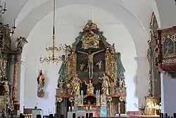 Der Hochaltar wurde 1815/16 aus figuralen und ornamentalen Teilen des Seitenaltars aus der ehemaligen Augustinerkirche aus dem zweiten Viertel des 18. Jahrhunderts zusammengesetzt. Im Zentrum des Altars steht ein um 1510 gefertigtes Kruzifix. Der linke Marienaltar entstand um 1750. Die Muttergottesstatue wird von den Statuen der heiligen Anna und Joachim flankiert. Die Tabernakeltür mit Kreuzigungsszene ist aus einer Metallplatte ausgeschnitten und bemalt. Auf dem rechten Seitenaltar ist das Altarblatt ein Leinwandbild des heiligen Antonius Abbas aus dem 20. Jahrhundert in einem barocken Rahmen. Den neugotischen Altarschrein in der Seitenkapelle schuf 1910 Alois Progar. Die Reliefszene zeigt die Anbetung der Madonna durch den heiligen Aloysius, in der Predella ist ein Engel mit dem Schweißtuch Christi dargestellt. Im Gesprenge steht eine Schutzengelstatue.