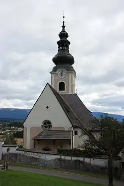 Das Gotteshaus ist eine um 1200 errichtete romanische Chorturmkirche. Das Langhaus wurde im 16. Jahrhundert verlängert. Südlich des Chorquadrats wurde die Sakristei angebaut. Im Barock wurde an der Südseite eine Kapelle errichtet und die Fassaden mit Putzpilastern neu gestaltet. Im 19. Jahrhundert erhielt die Kirche ein südliches Seitenschiff. Alle Fenster bis auf das östliche Chorfenster wurden neugotisch umgestaltet. Der mächtige Chorturm wurde mehrmals erhöht. Die Schallfenster in den romanischen und gotischen Glockengeschoßen wurden vermauert. Heute besitzt der Turm im fünften Geschoß rundbogige, barocke Schallfenster. Er und wird von einem Zwiebelhelm von 1766 bekrönt. Die älteste Glocke wurde 1435 gegossen. 1993/94 legte man an der Westfassade ein spätgotisches Ölbergfresko frei. Neben dem Kielbogenportal ist ein romanisches Flechtbandkapitell eingemauert.